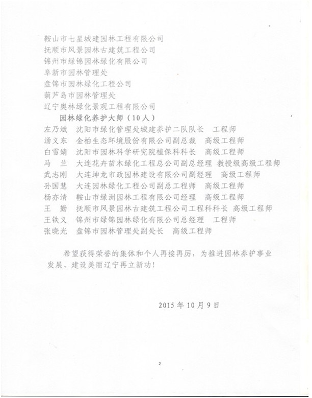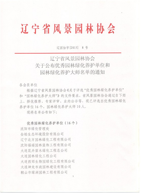 年度遼寧省風景園林協會經過嚴格評審,大連園林綠化工程公司被評為“優秀園林綠化單位”榮譽稱號,工程名稱(大連市體育中心配套工程綠化工程一標段)。孫國慧被評為“園林養護大師”榮譽稱號,先后參加養護工程有
